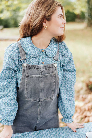 Blusa mujer de manga larga en tejido de flores en tonos azules y verde petróleo. La manga acaba con un bonito engomado. Lleva un cuello grande que acaba en un volantito, detalle en tendencia. En la parte delantera lleva botones de madera y el mismo volante que en el cuello. Fabricado por Regina for kids. Pertenece a la colección AMAPOLA AZUL.