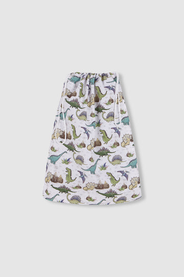 Bolsa ropita en tono blanco roto con graciosos dibujos de dinosaurios en tonos verdes con cordoncillo blanco en el extremo para poder cerrarla. Se lava muy fácilmente y es resistente para el colegio y la guardería Las medidas son 46 cms. x 34,5cms La composición es 100 % Algodón. Fabricado en España para Regina for kids. Va a juego con la bata colegial PARQUE JURÁDICO.