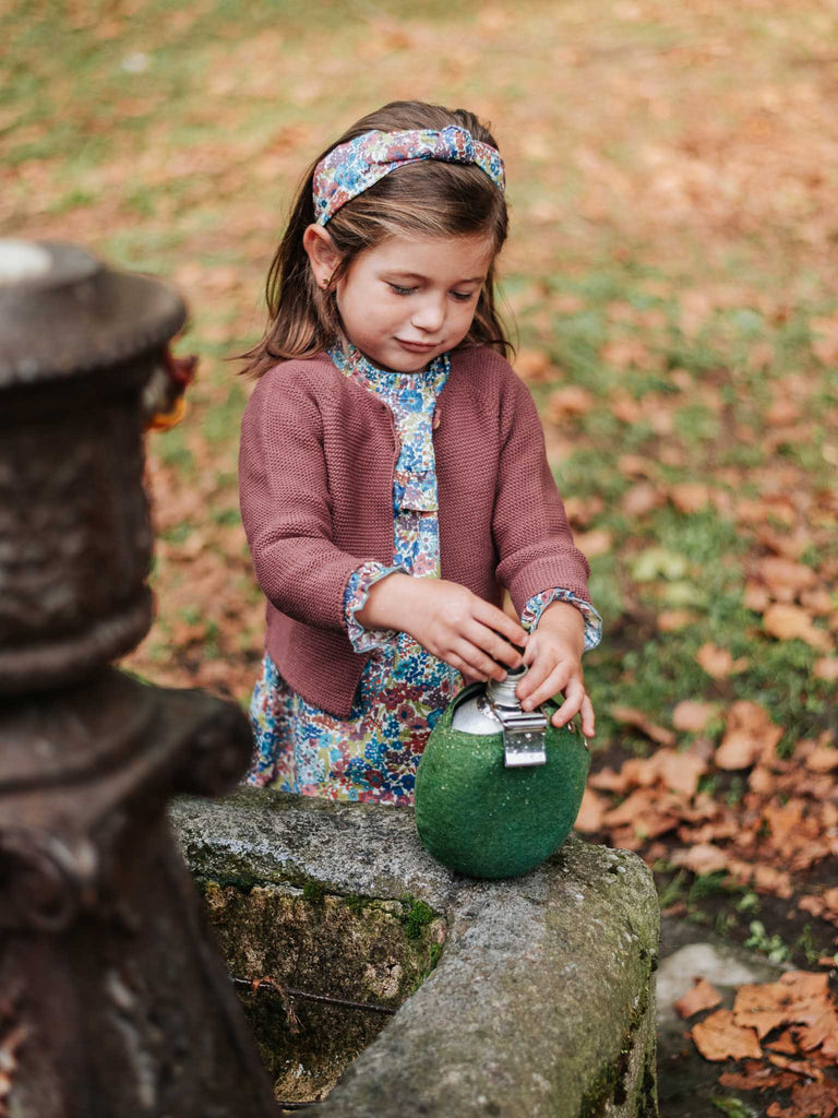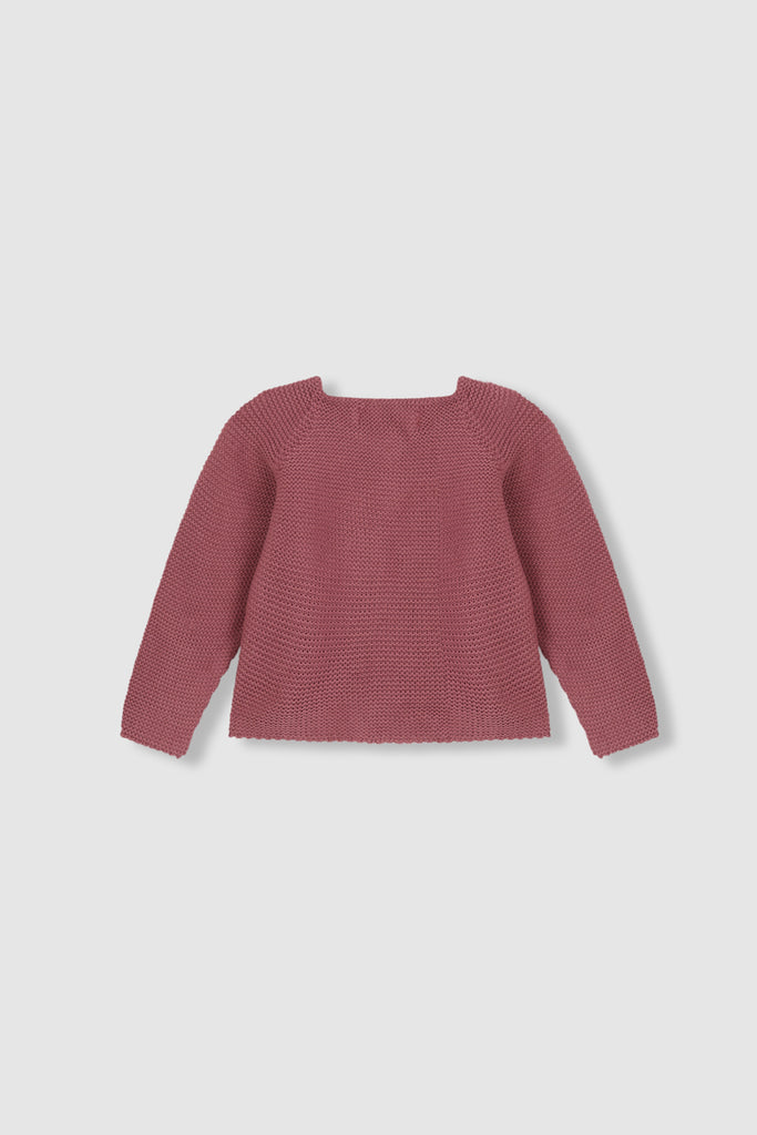 Chaqueta larga en punto bobo de color ciruela empolvado. Uno de los básicos de punto para niños de Regina for Kids. Abierta en la parte delantera con dos botones de madera. Ideal para otoño - invierno. La composición es 100 % Acrílico. Fabricado en España para Regina for kids.