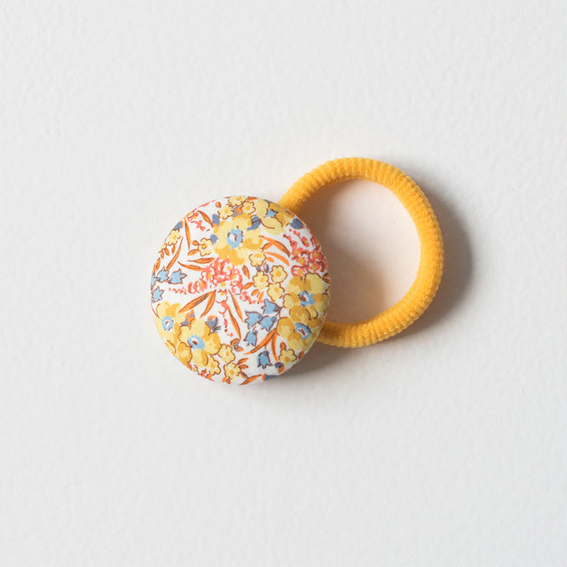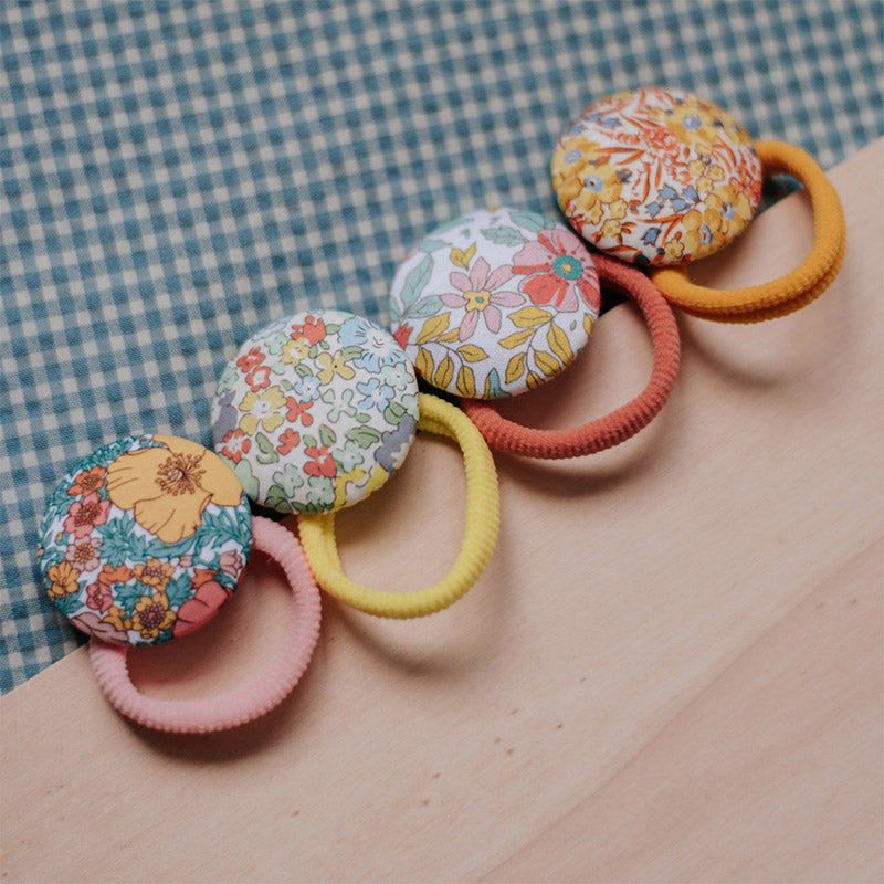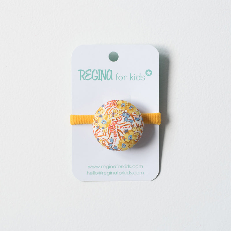 Coletero forrado con el tejido de flores de la colección OLITE, de flores en color amarillo,naranja y azul. La goma es de espuma, la clásica, en color amarilla. Ideal para las niñas o teens que no les gusta los lazos pero sí les gusta un bonito accesorio de pelo.
