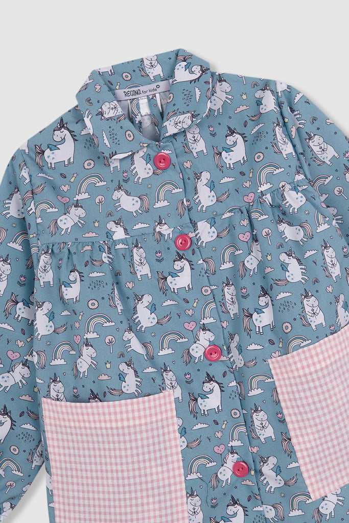 Babi colegial color verde agua con estampado de graciosos unicornios blancos. Llevan puños de goma. Lleva cuello. Los bolsillos los tiene en la parte delantera en vichy rosa y los botones son de color fucsia. Lleva incorporada una cinta en el cuello para que la niña pueda colgar y descolgar su bata fácilmente. En la colección tiene también bolsa de ropita y bolsa de merienda. Composición 100 % ALGODÓN. Hecho en España en exclusivadad para Regina for kids.