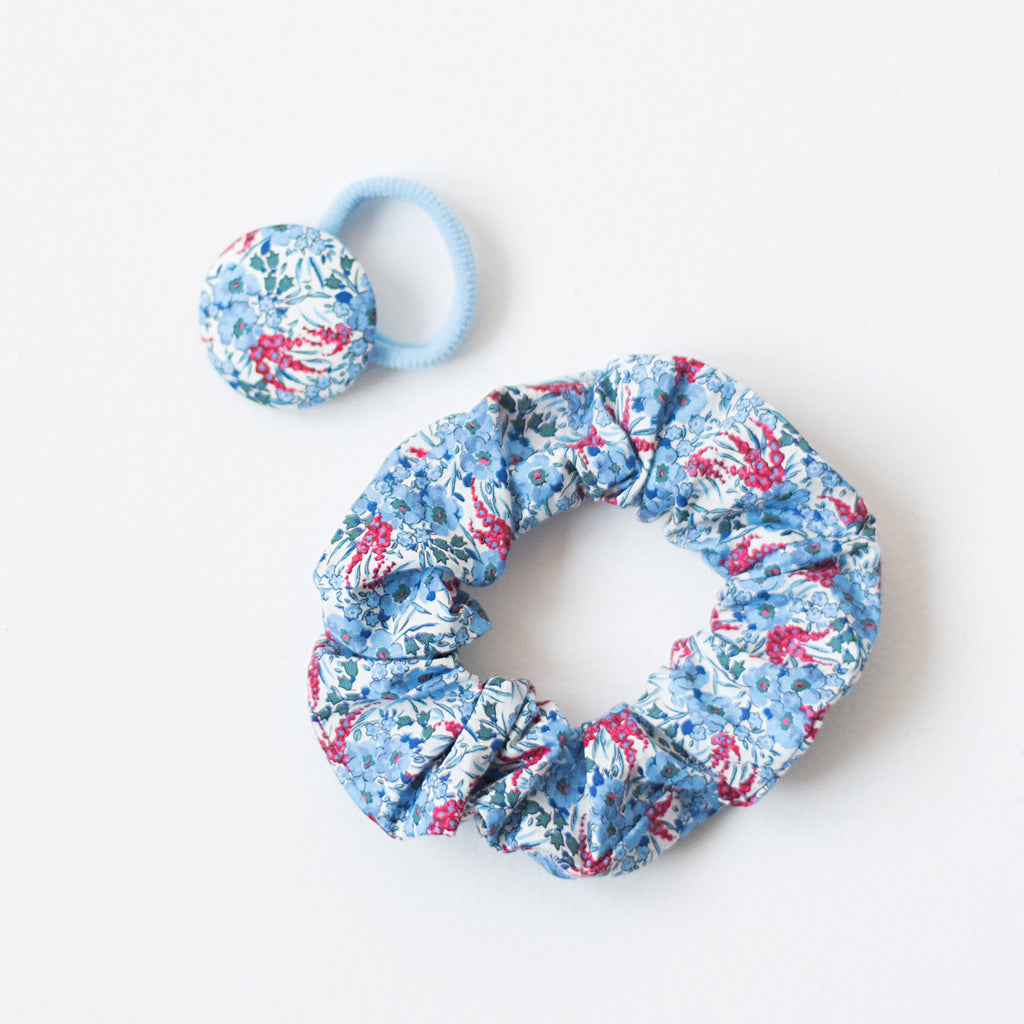 Coletero forrado con el tejido de flores de la colección MUNDAKA, de flores en tonos azulón y rojol. La goma es de espuma, la clásica, en color azulado. Ideal para las niñas o teens que no les gusta los lazos pero sí les gusta un bonito accesorio de pelo.