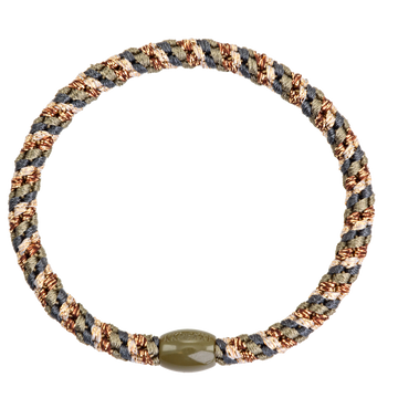La goma de pelo más original, elástica y duradera. La auténtica Kknekki más fina en color gris y camel con pinceladas de glitter. Ideal para las teens y las mamás para ir cómodas y a la última.