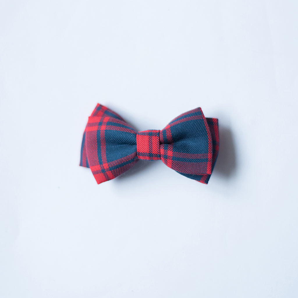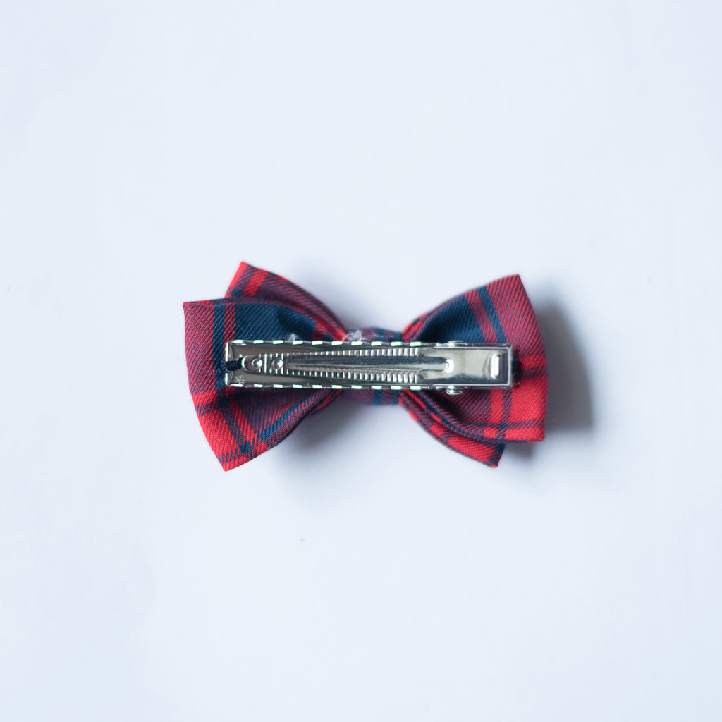 Gancho para el pelo estilo pico pato color plata, con doble lazada en tejido de cuadros azul marino y rojo. La lazada está cosida.