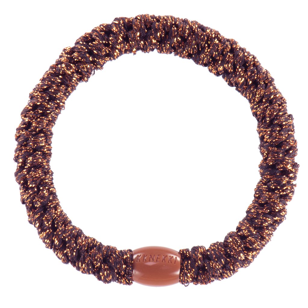 La goma de pelo más original, elástica y duradera. La auténtica Kknekki en color bronce con pinceladas glitter. Ideal para las teens y las mamás para ir cómodas y a la última.