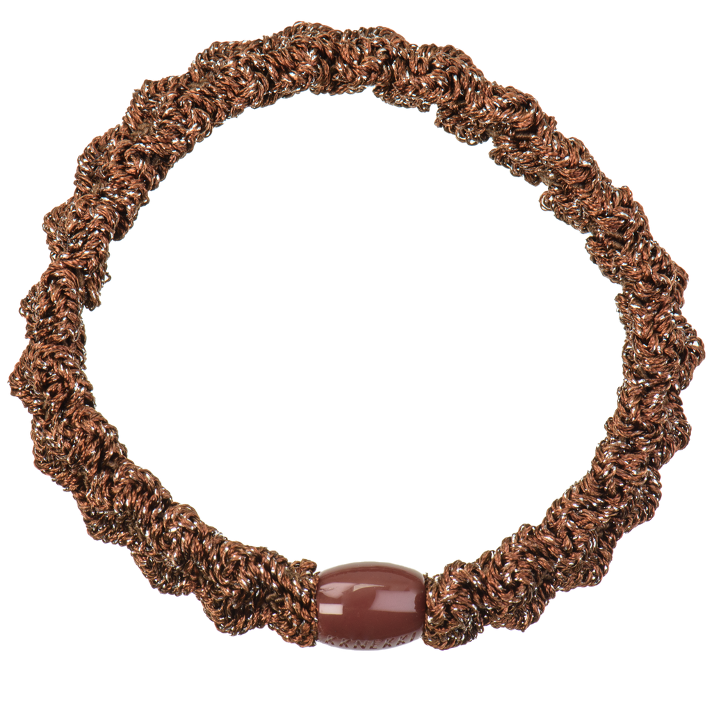 La goma de pelo más original, elástica y duradera. La auténtica Kknekki de color marrón glitter. Ideal para las teens y las mamás para ir cómodas y a la última.
