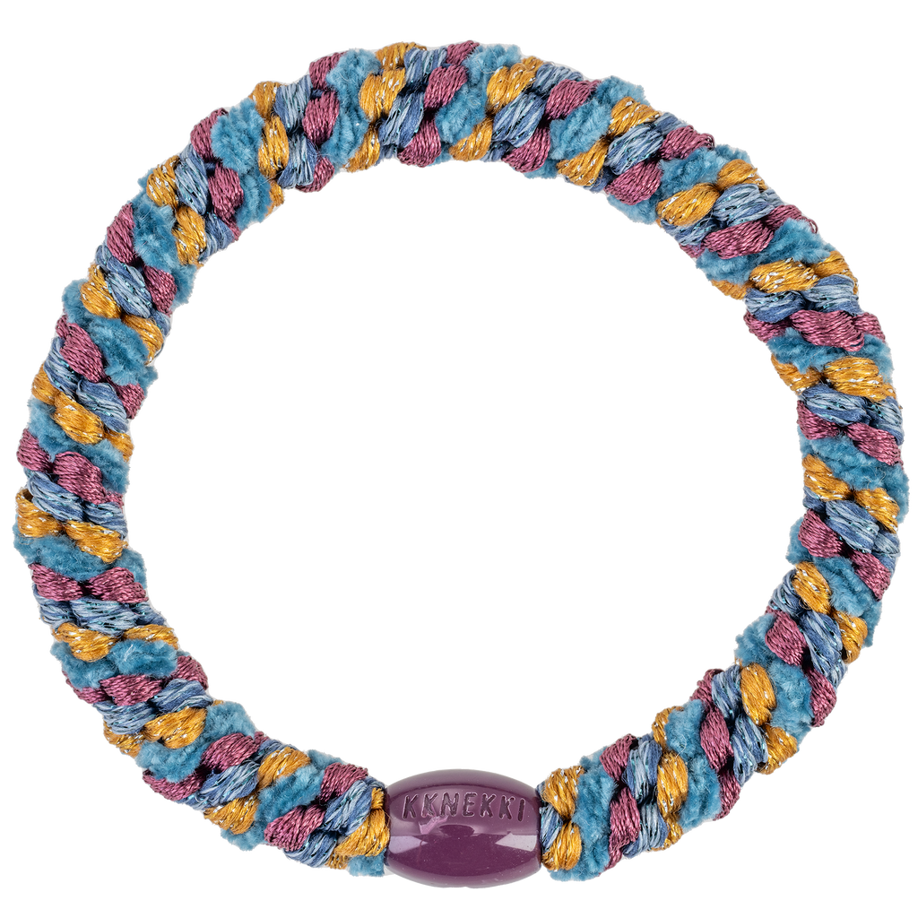 La goma de pelo más original, elástica y duradera. La auténtica Kknekki combinada en tonos azules, berenjena y un toque mostaza con pinceladas glitter. Ideal para las teens y las mamás para ir cómodas y a la última.