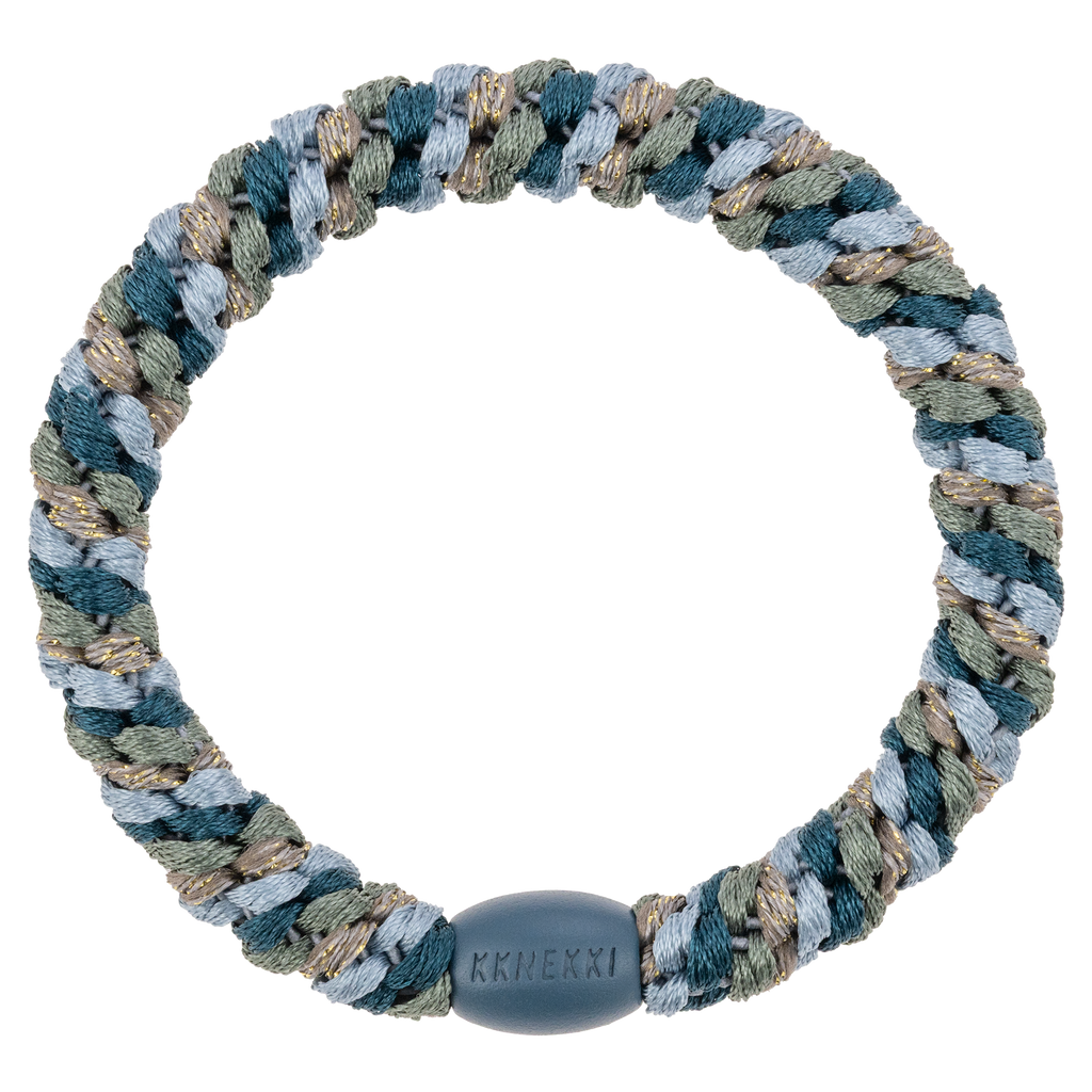 La goma de pelo más original, elástica y duradera. La auténtica Kknekki en color petróleo y azul con pinceladas de glitter. Ideal para las teens y las mamás para ir cómodas y a la última.