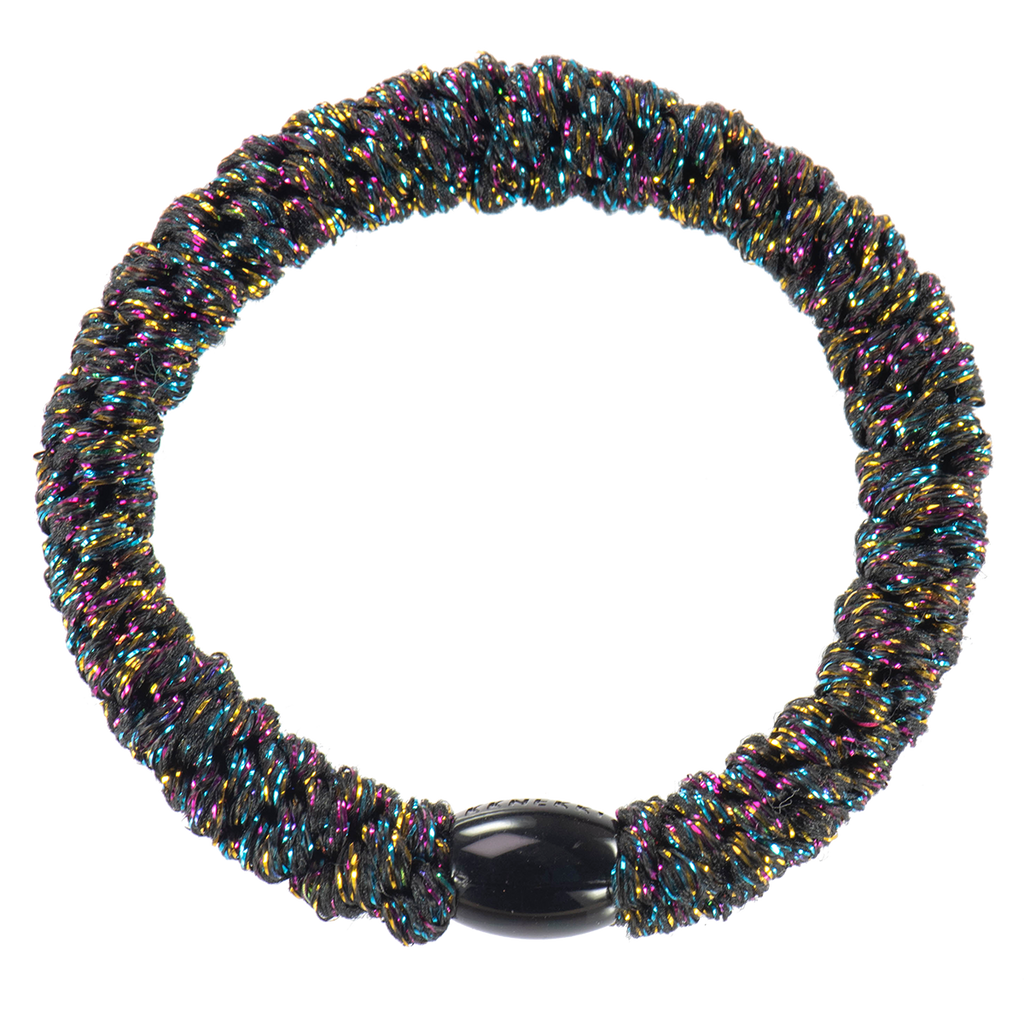 La goma de pelo más original, elástica y duradera. La auténtica Kknekki en color negro con pinceladas glitter en varios tonos. Ideal para las teens y las mamás para ir cómodas y a la última.