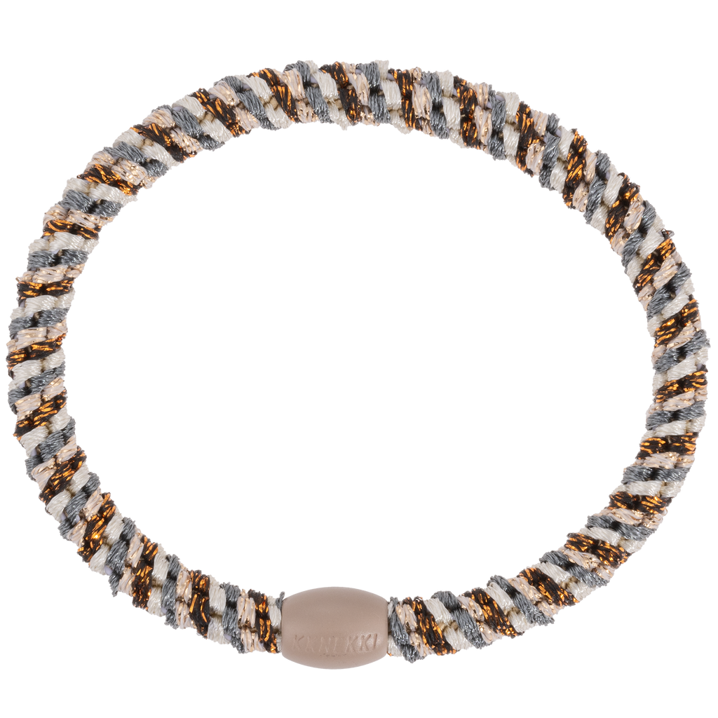 La goma de pelo más original, elástica y duradera. La auténtica Kknekki más fina en tonos camel y gris con una pincelada de glitter. Ideal para las teens y las mamás para ir cómodas y a la última.