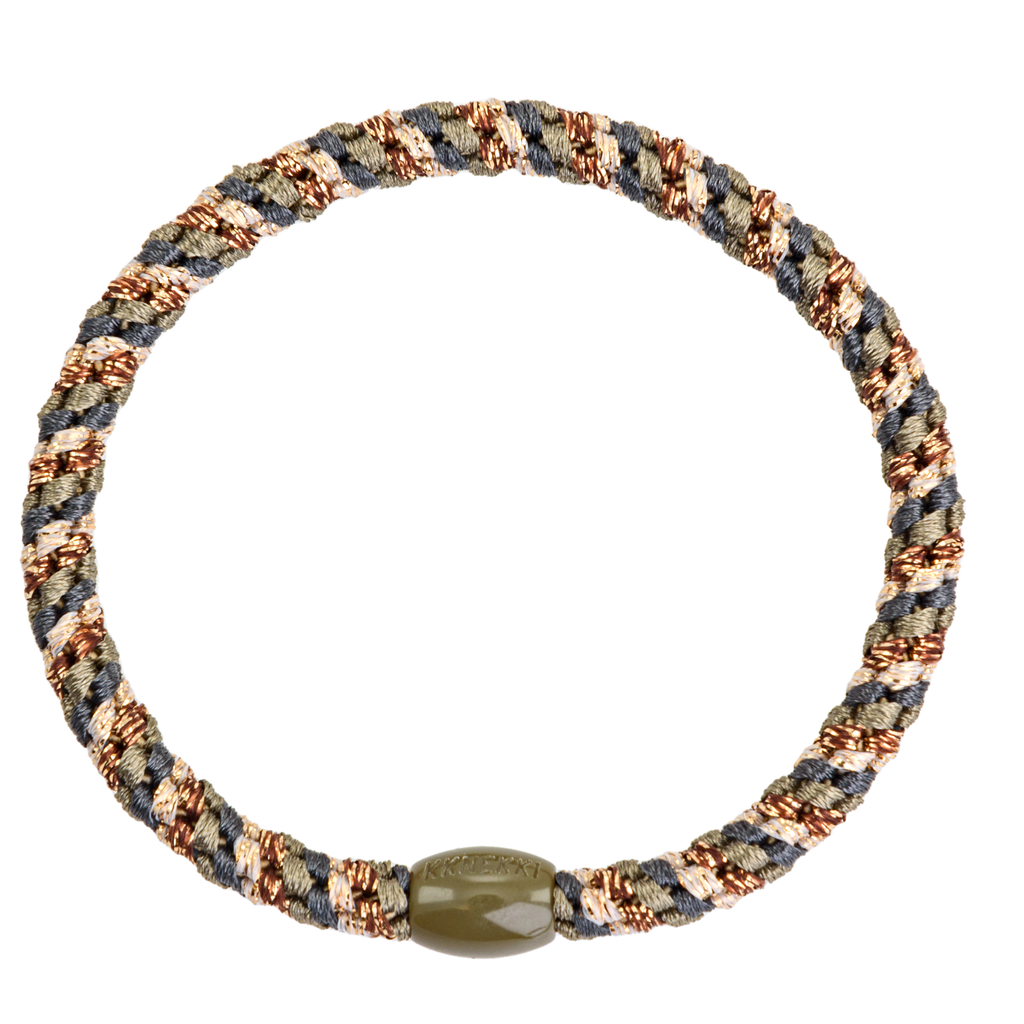 La goma de pelo más original,elástica y duradera. La auténtica Kknekki más fina en color gris y camel con pinceladas de glitter. Ideal para las teens y las mamás para ir cómodas y a la última.