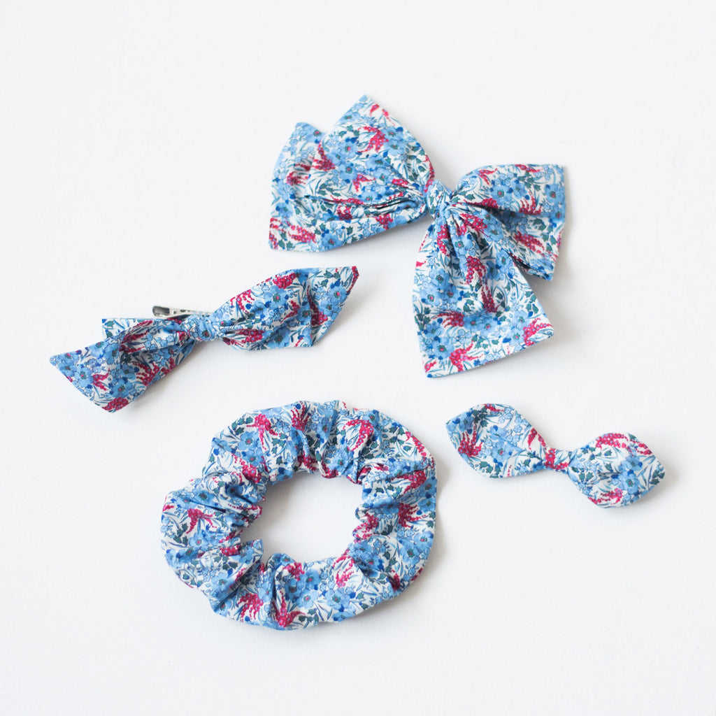 Lazo confeccionado con tejido de flores tipo Liberty con estampados en tonos azulones y rojos. Opción con goma o con pinza pico pato para sujetar al pelo. Este producto está hecho a mano, por lo que puede presentar pequeñas variaciones sobre la foto. Hecho a mano con cariño en España para Regina for kids. Pertenece a la colección MUNDAKA.
