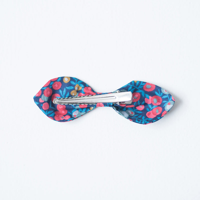 Lazo Rocío confeccionado con tejido estampado de flores Liberty London en colores azul marino, turquesa, fresa, coral. gris y ocre. El lazo se sujeta con pico pato. Mide10 cms. de largo y la pinza 4,5 cms. Fabricado a mano en España para Regina for kids. Pertenece a la colección ROCÍO.