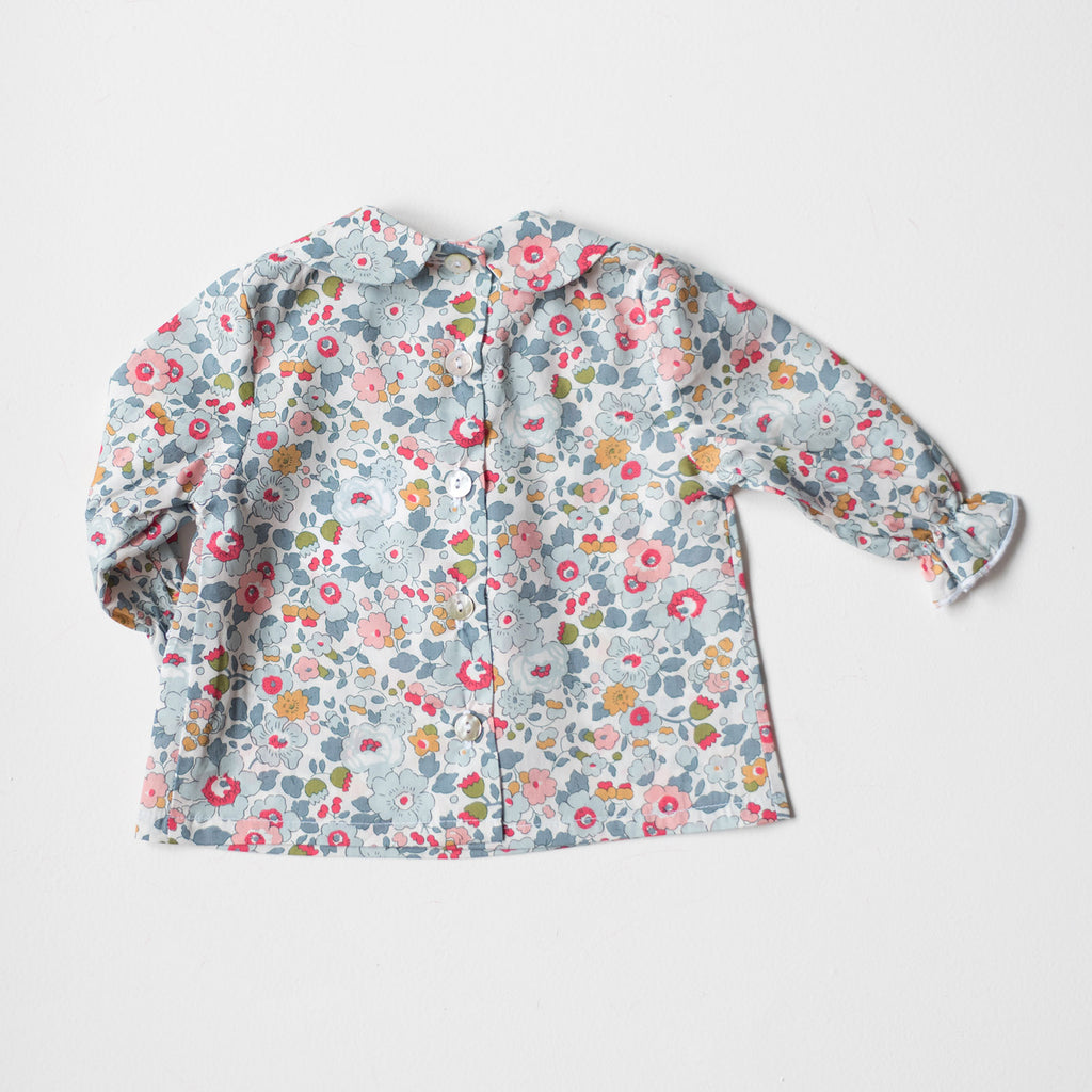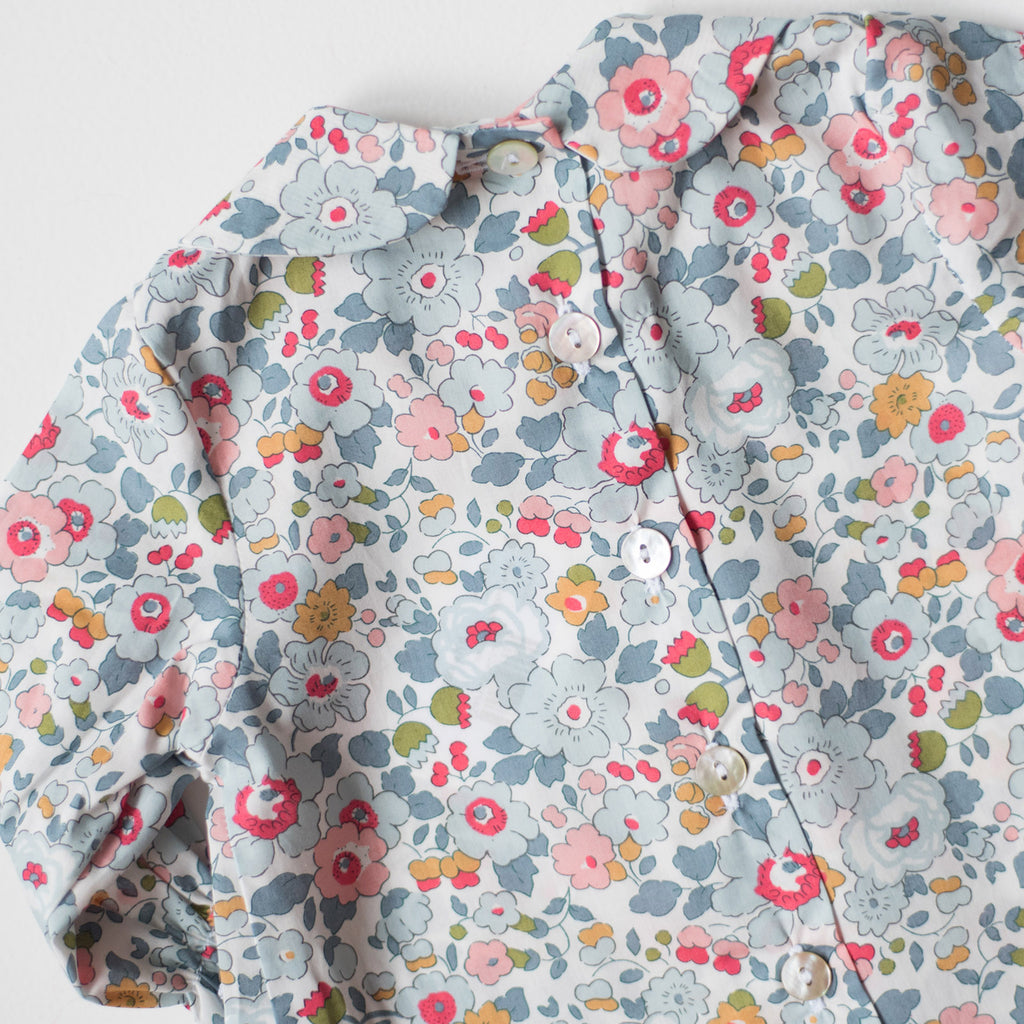 Blusa de manga larga con estampado floral en tejido Liberty London en colores azules, rojo, rosa y ocre, tiene un bonito cuello bebe y abertura con botones nacarados en la espalda. Todo un clásico para las amantes de los tejidos Liberty. La composición es 100 % Algodón. Exclusivo en Regina for kids
