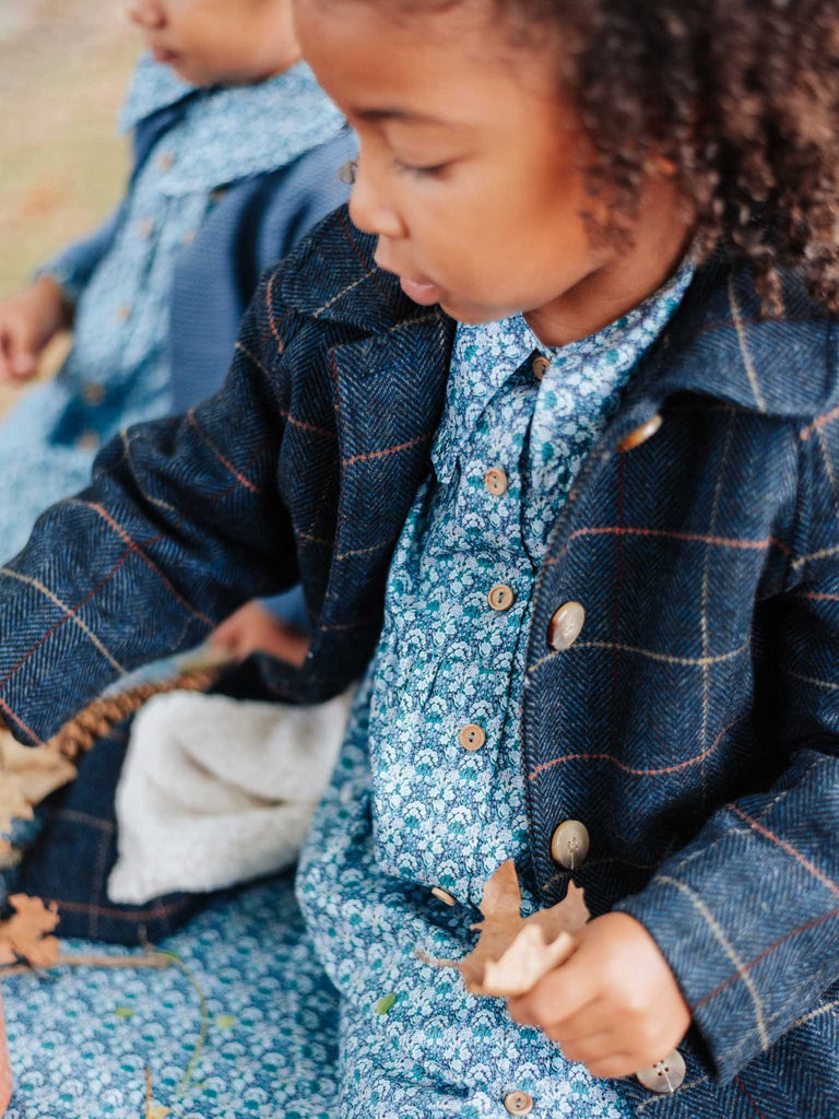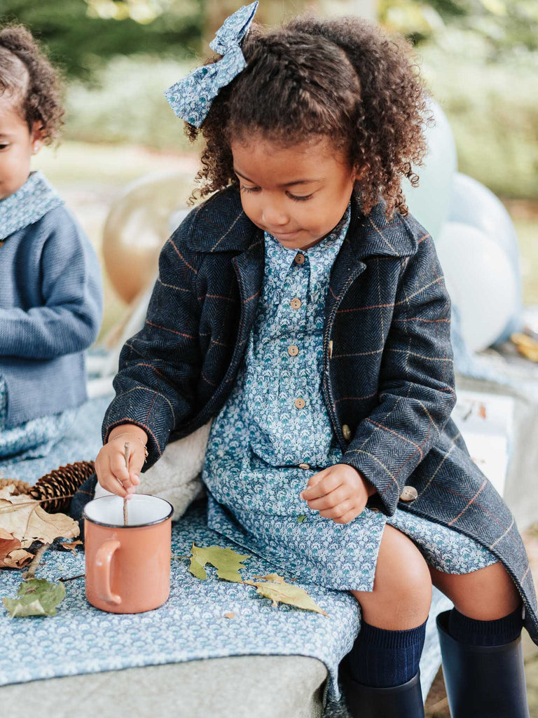 Abrigo de paño para niña de espiga en tonos azul tinta, gris y una pincelada en color terracota. De corte clásico con bolsillos y manga ranglan. Su interior está forrado por un suave y cálido borreguito beige. Composición tejido exterior 50% Lana y 50% Poliester y tejido interior 100% Poliester. Ideal para los dias más fríos de invierno. Fabricado en España para Regina for Kids.