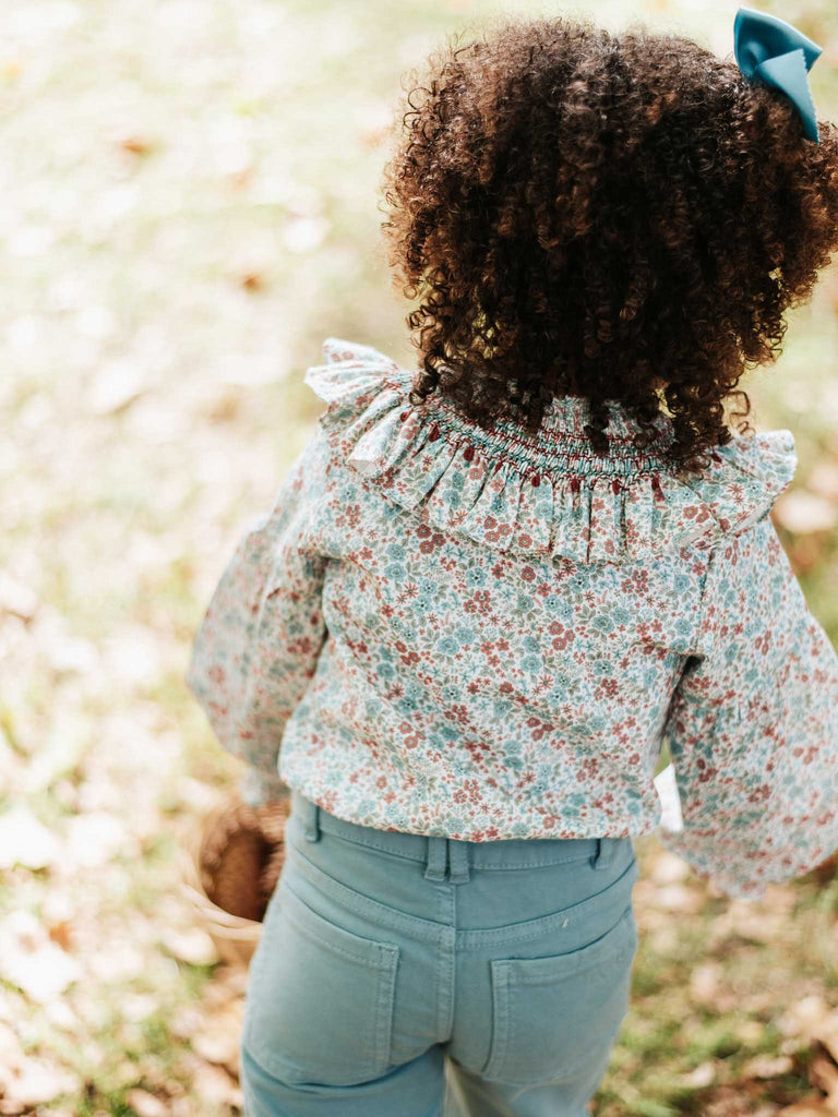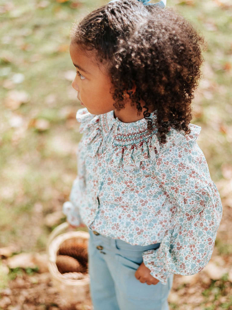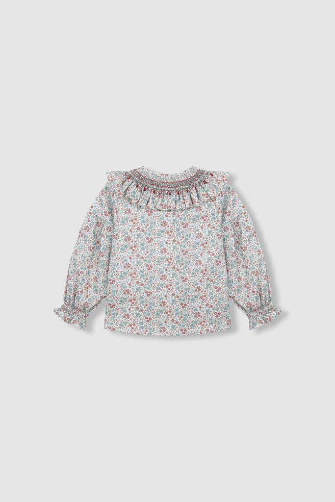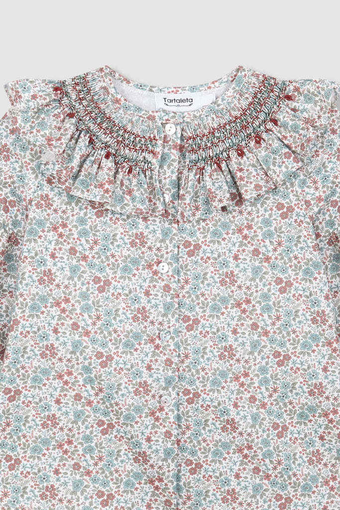 Blusa abierta en tejido de viyela con florecitas verde liquen y teja. . Lleva cuello con un smock o nido de abeja hecho a mano. Fabricado en España para Regina for kids.