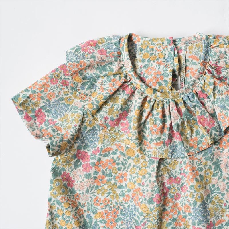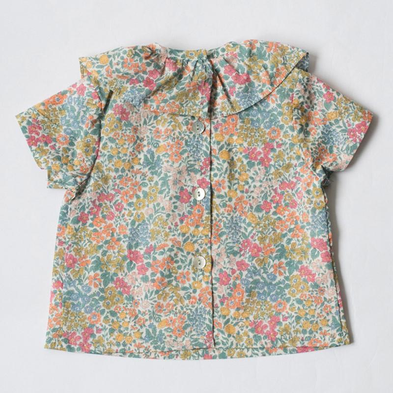 Blusa de manga corta con estampado floral en tejido Liberty London en colores fucsia, amarillo, verde seco, rosa, azul, naranja tiene un bonito cuello volante y abertura con botones nacarados en la espalda. Todo un clásico para las amantes de los tejidos Liberty. La composición es 100 % Algodón Exclusivo en Regina for kids