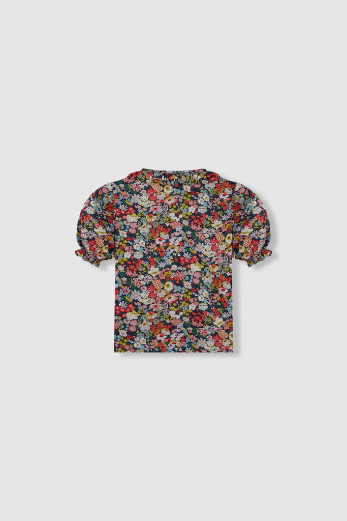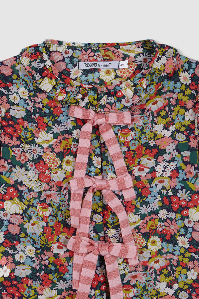 Blusa de flores Liberty London en tonos corales, azules y verdes. Un tejido alegre y mítico en Liberty. Lleva cuello bebé con volante. En vez de botones lleva lazos en tejido de rayas en tonos corales. Todo un clásico para las amantes de los tejidos Liberty. La composición es 100 % Algodón. Fabricado en España para Regina for kids. Pertenece a la colección SARA.
