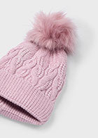 Gorro para niña en color rosa subido con una mezcla de glitter. Lleva pompón de pelo al tono. Fabricado por Mayoral.