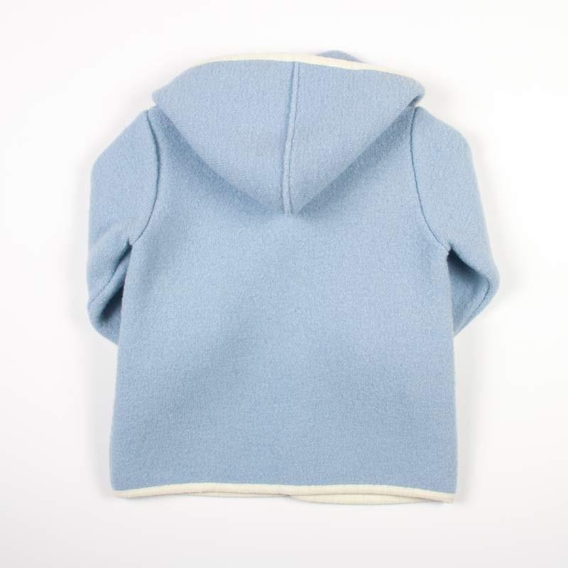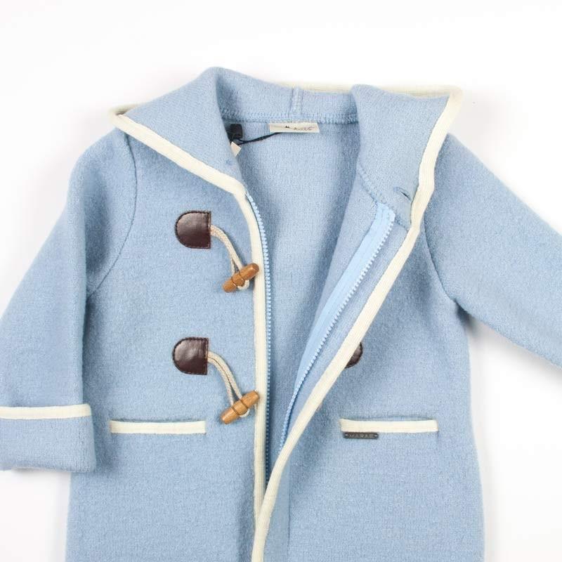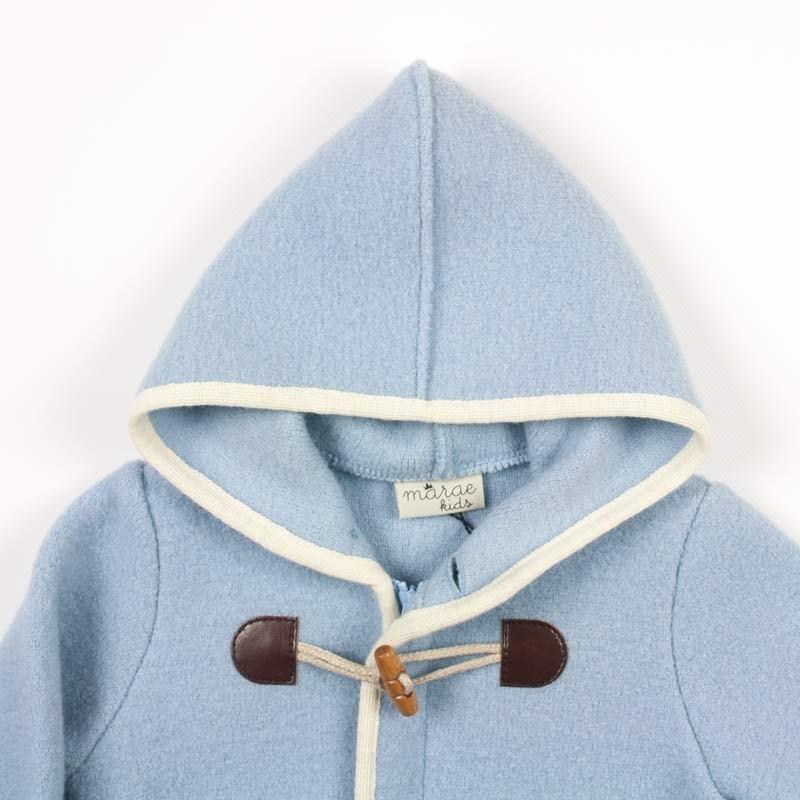 Trenca de lana con capucha en color azulado ribete en crudo. De lana cálida y suave, para el otoño e invierno. Se cierra con cremallera y con enganches clásicos de madera y cordón. Con dos bolsillos en la parte delantera La composición es 100 % Lana de muy alta calidad Fabricado en España.