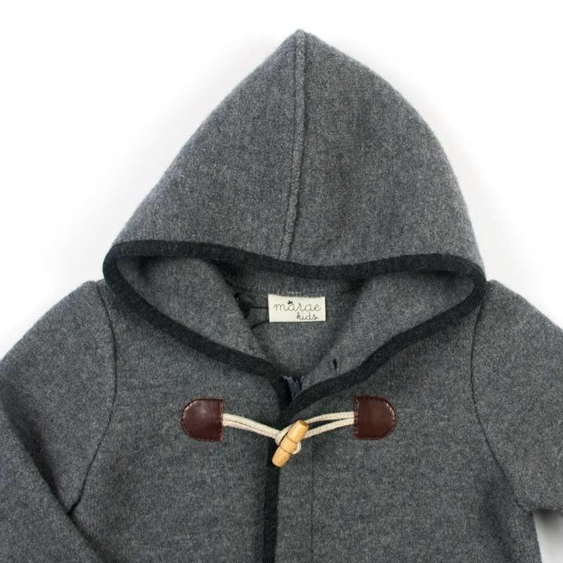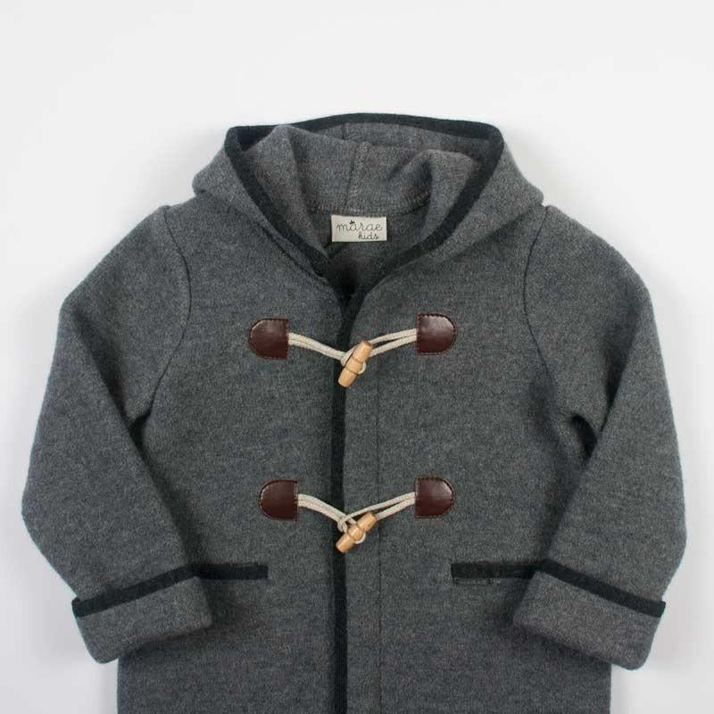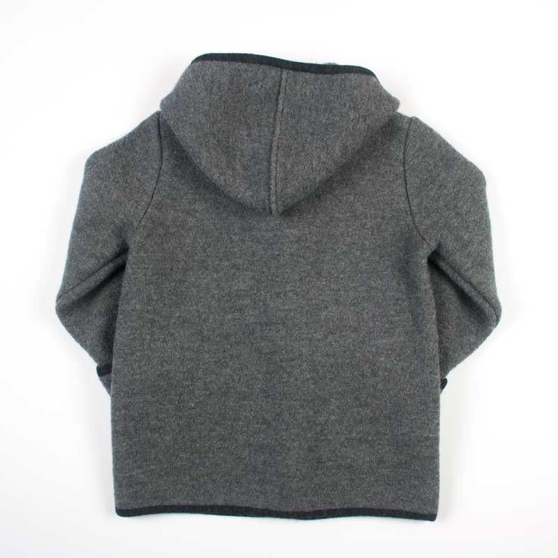 Trenca de lana con capucha en color gris medio con ribete en gris antracita. De lana cálida y suave, para el otoño e invierno, queda ideal con ropita de niño y niña. Se cierra con cremallera, con enganches clásicos de madera y cordón. Con dos bolsillos en la parte delantera La composición es 100 % Lana de muy alta calidad. Fabricado en España