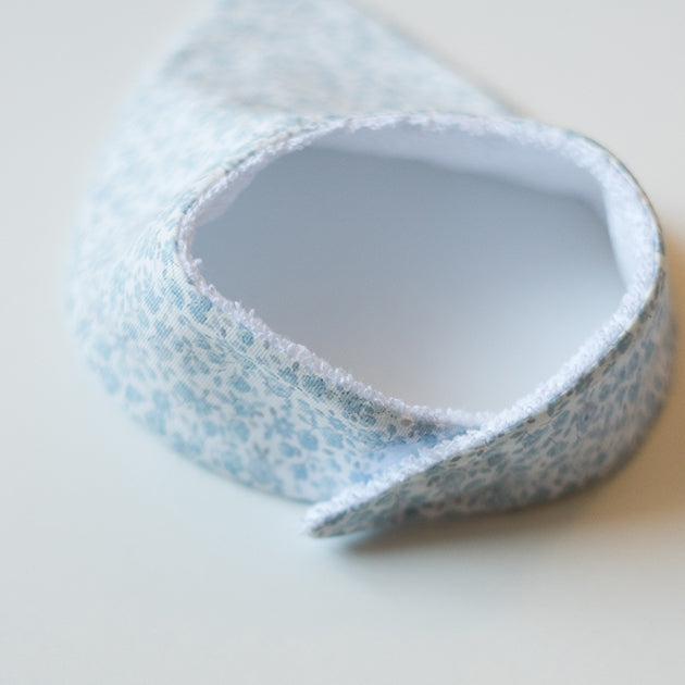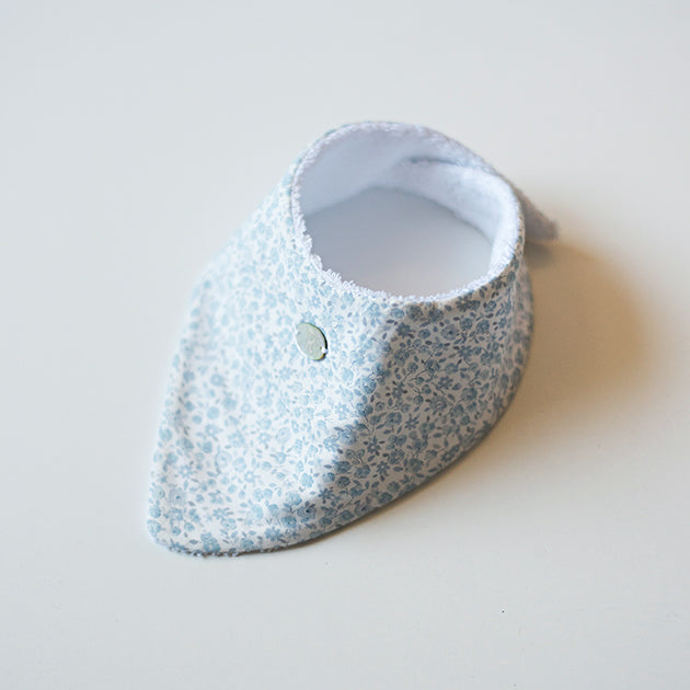 Bandana o babero babitas de felpa blanca forrado con el tejido de florecitas celeste, colección HANA. Lleva velcro cosido para el cierre y nuestra R en una pequeña placa de nácar El babero mide 13 cms. de ancho en el pico. Está fabricado en España para Regina for kids.