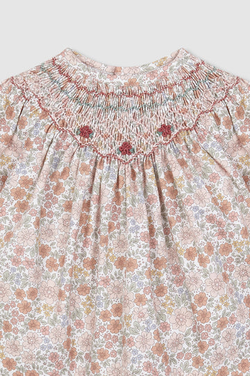 Jesusito compuesto de vestido de manga larga y braguita a juego en tejido de viyela rosa empolvado con florecitas en tonos rosa palo, teja, verde y azul. Lleva en la pechera un smock o nido de abeja hecho a mano. Fabricado en España para Regina for kids.