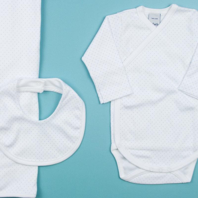 - Body de manga larga, cruzado por delante, en la talla 1 mesArrullo o mantita de 75 cms. x 75 cms, de algodón, blanco por una cara y con motitas en azul por la otraBabero pequeño con cierre de clip
