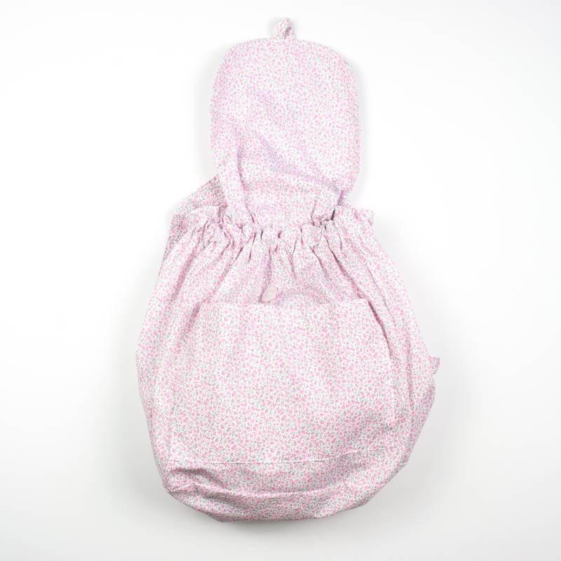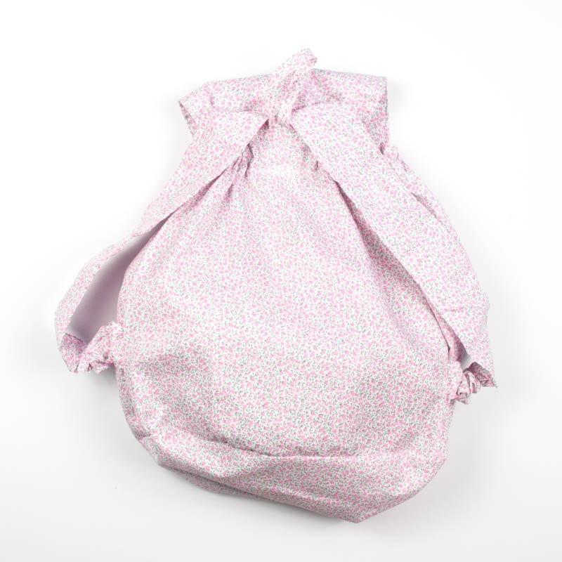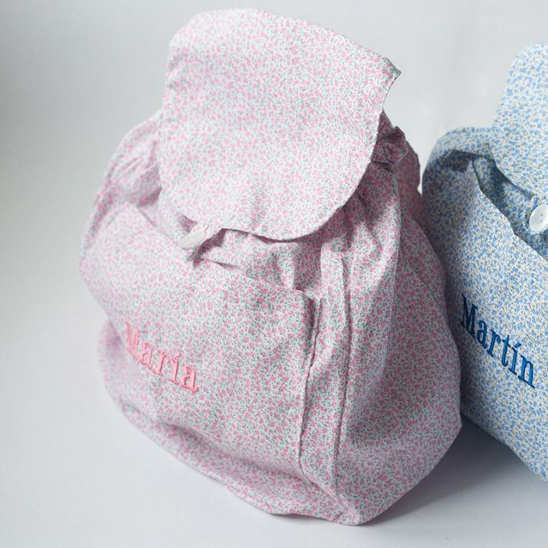 Mochila en tela de flores pequeñas rosas ideal para la guardería o para el colegio, para los pequeños de la casa. Con un gran bolsillo en la parte delantera y boca con elástico. Solapa con cierre de botón en color anacarado. En la parte trasera tiene una cinta para colgar la prenda y los tirantes llevan elásticos Las medidas son: 35 cms de alto x 27 cms de ancho x 16 cms de fondo La composición es 50 % Algodón - 50 % Poliéster Fabricado en España.