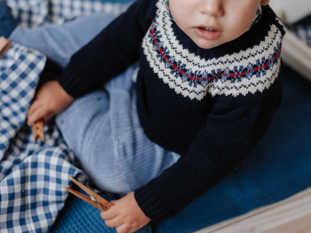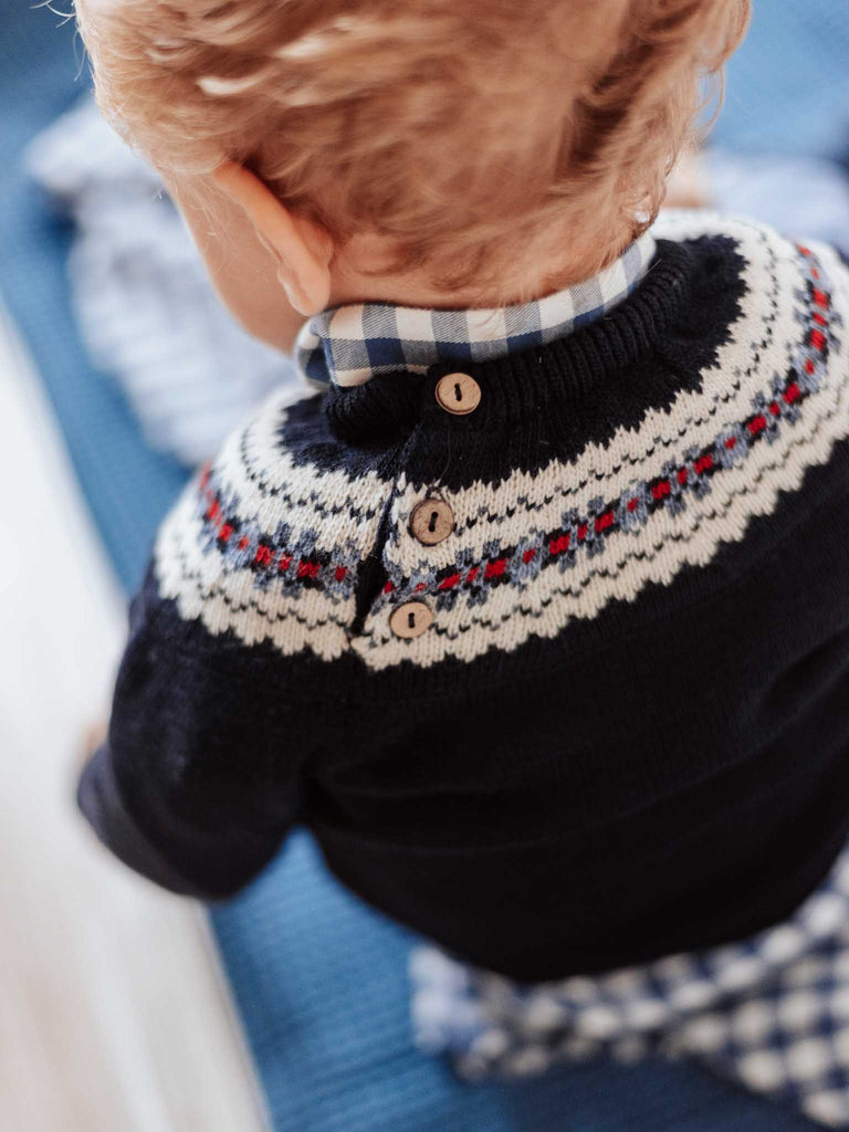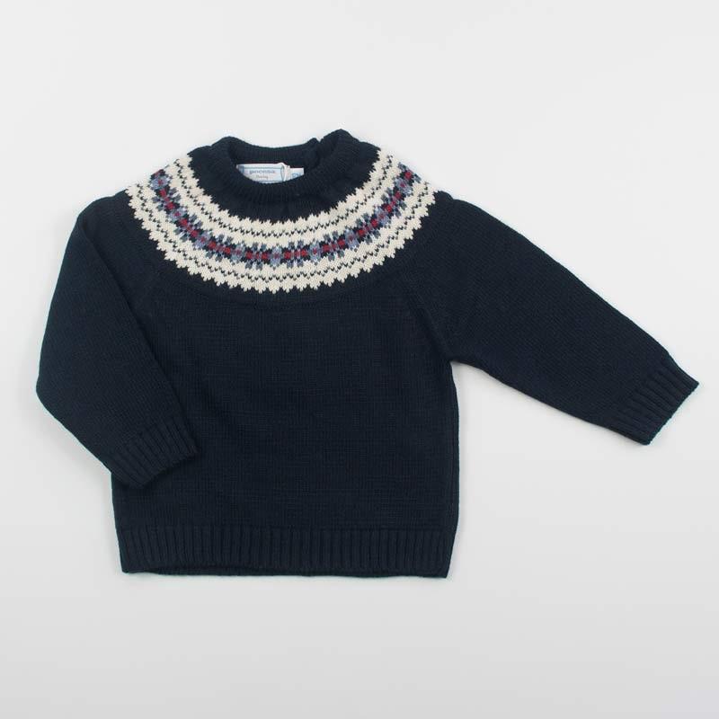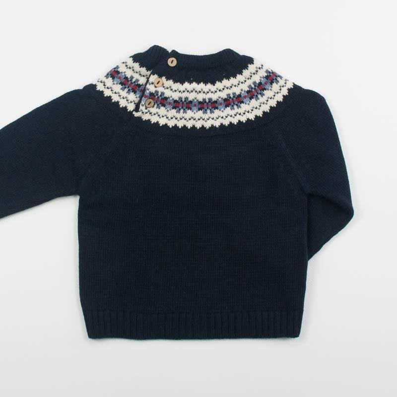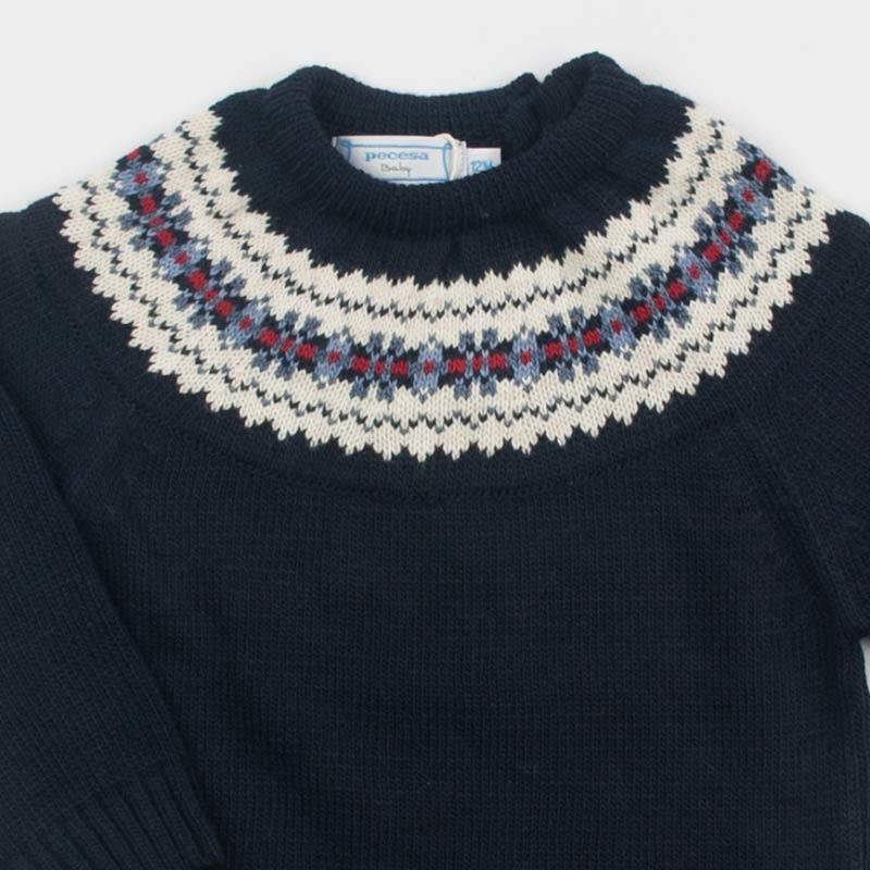 Jersey azul marino con greca clásica en en la pechera o canesú. La greca lleva tonos en crudo, azul francia y guinda. ¡Ideal para combinar con todo! Lleva cuello redondo con3 botones de madera en la parte trasera del canesú. Pónselo con sus pantalones de pana, con pitillos, faldas o jeans La composición es 100 % Acrílico Se puede lavar en lavadora Fabricado en España